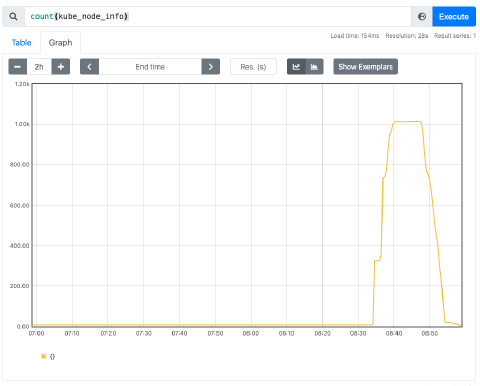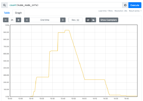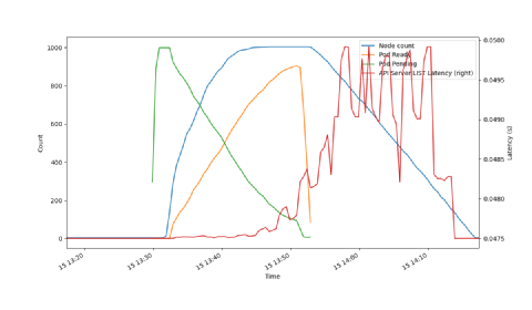 Eventually, I was able to obtain a 50-minute 1000 node scale-up and down, as shown in the plot below.