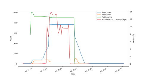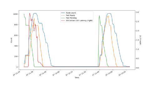 The plot below shows the API latency spike when large numbers of pods are trying to start. It returns to normal once the majority of pods have been completed.